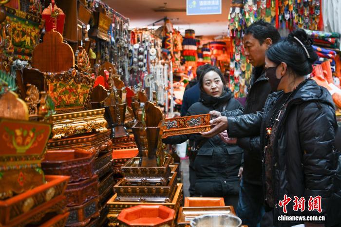 圖為市民在八廓商城選購年貨切瑪盒。中新社記者 貢嘎來松 攝