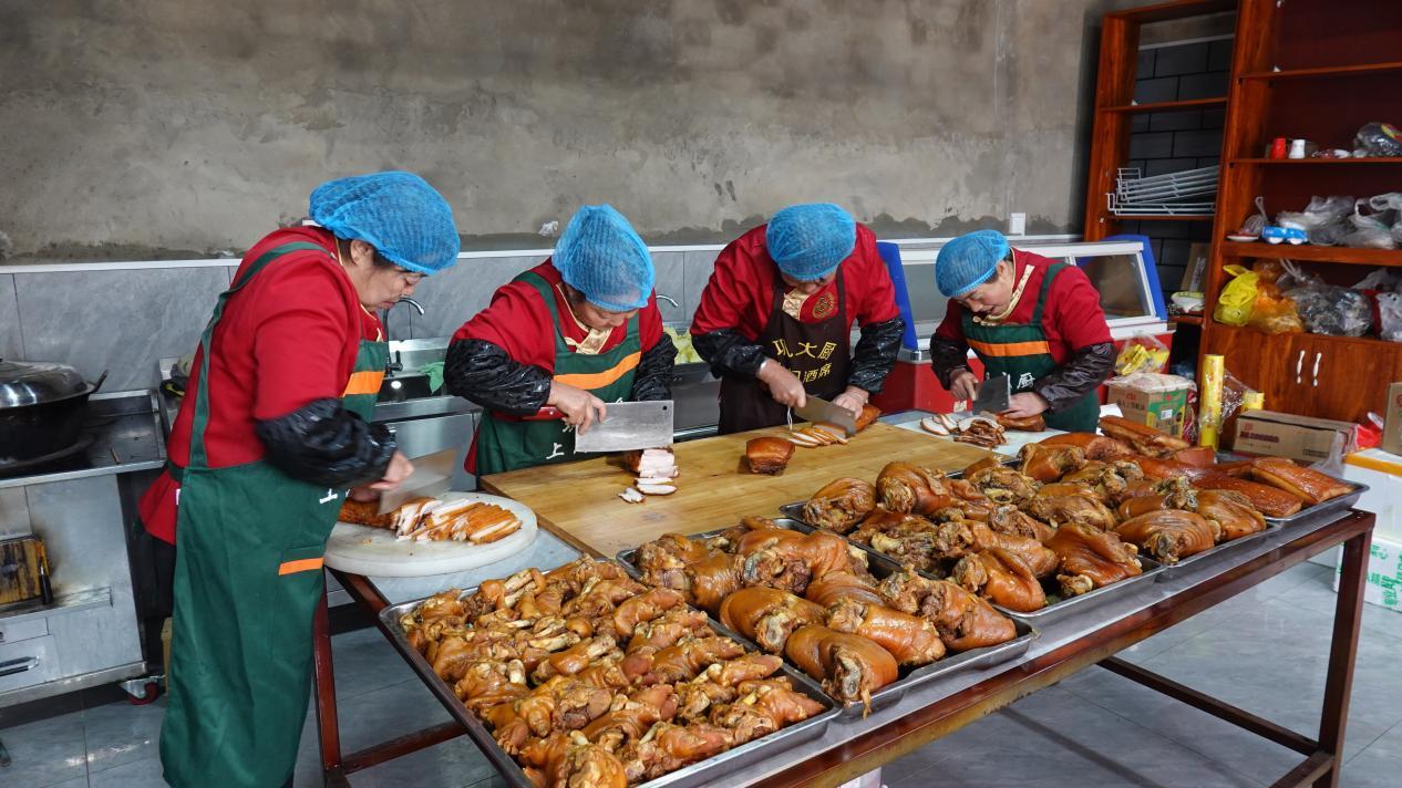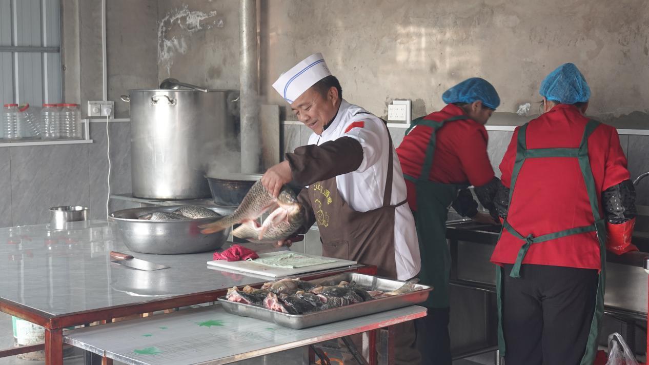食材加工間里,村民蔣淑芳正在仔細(xì)刷豬蹄,她是團(tuán)隊(duì)里的老人了。這份工作,她很知足,工資每月多的時(shí)候能掙四五千。負(fù)責(zé)切菜的漫玉也是南屯村人,今年55歲,她原本在城里的餐廳打工,去年底為了照顧生病的哥哥,辭工回了家,也加入了鞏大廚的團(tuán)隊(duì)。