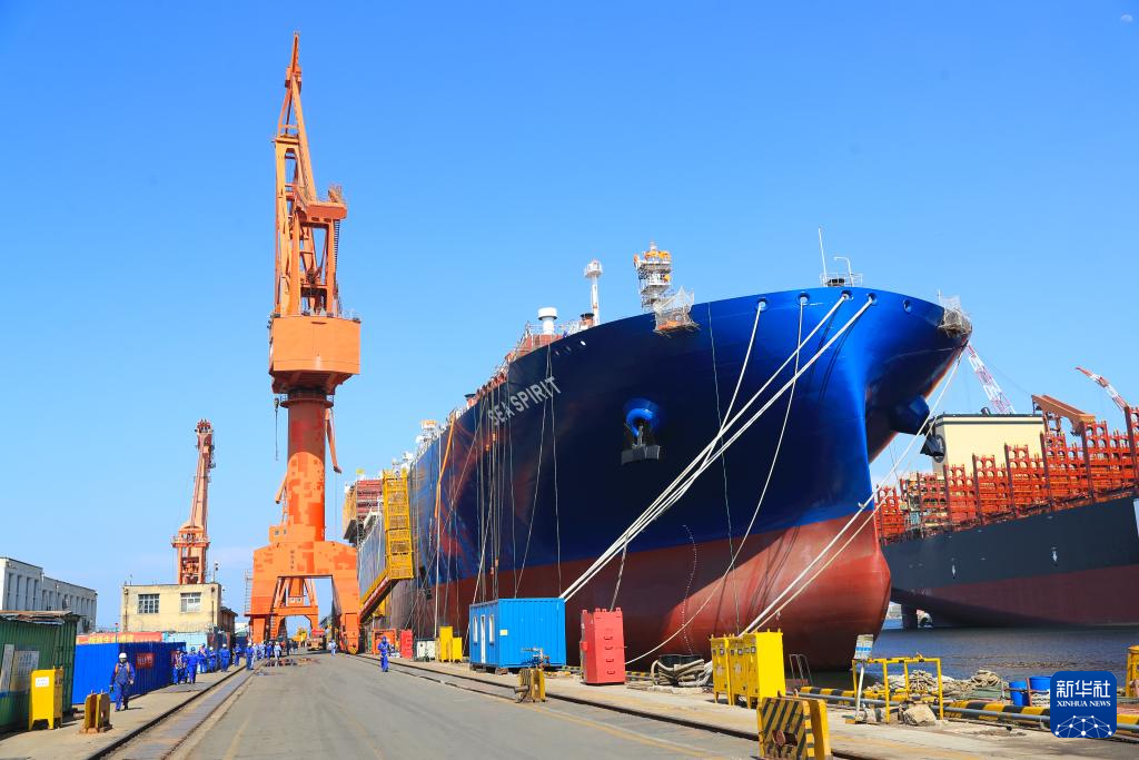 在中國船舶集團大連船舶重工集團有限公司拍攝的正在建造的大型液化天然氣(LNG)運輸船(2024年6月15日攝)。