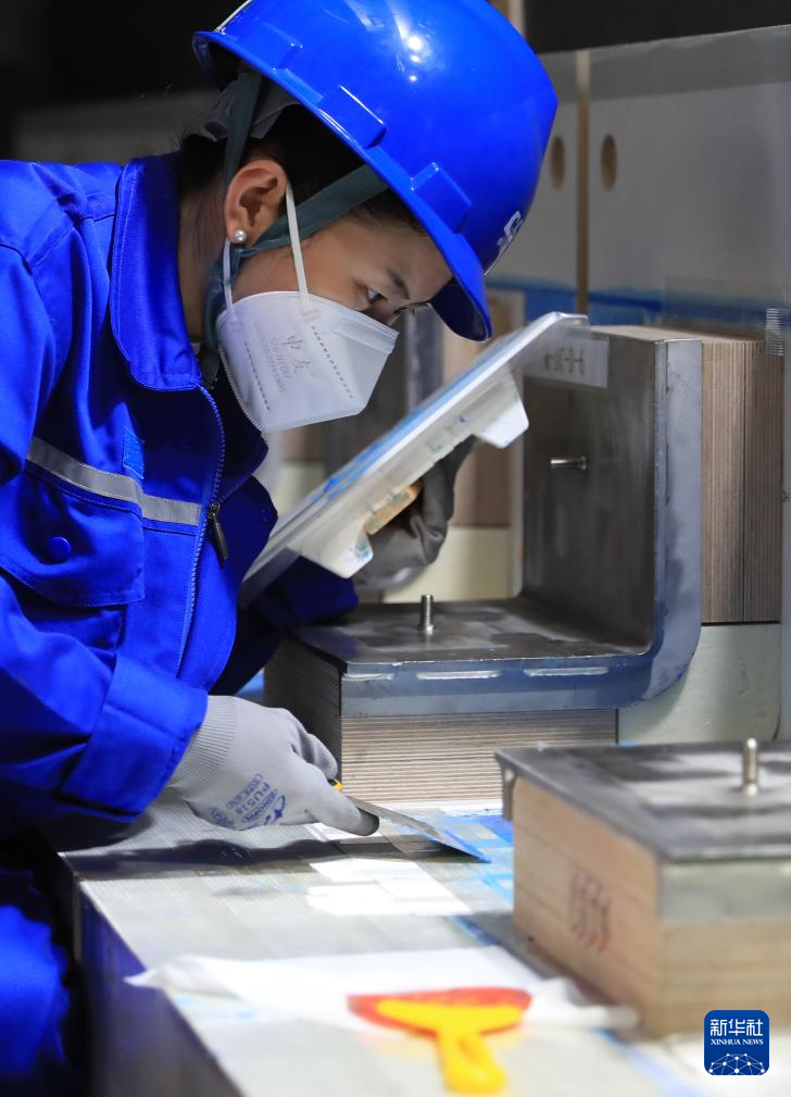 在中國船舶集團大連船舶重工集團有限公司LNG綜合培訓中心,一名學員在練習次屏壁手工粘連作業(yè)(2024年6月15日攝)。