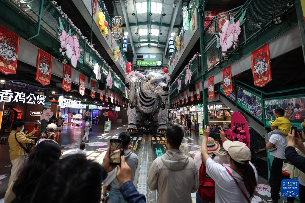 游客在遼寧省大連市熊洞街觀看仿生機械巨熊表演(2024年5月22日攝)。