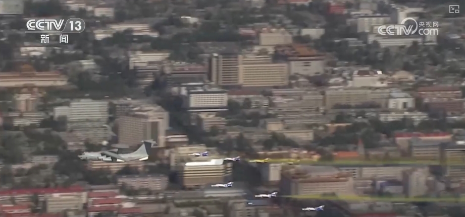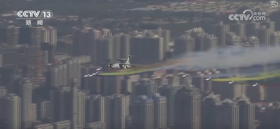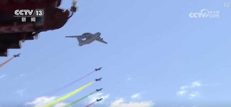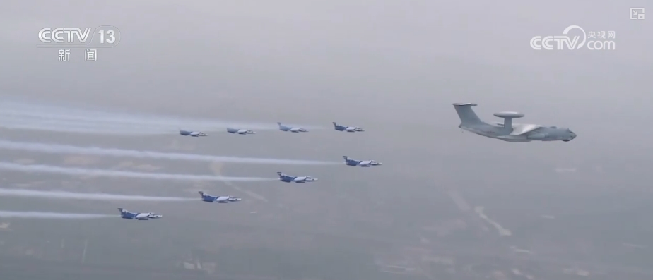 這是2009年10月1日,新中國(guó)成立60周年閱兵式上,機(jī)群飛過(guò)天安門廣場(chǎng)的壯觀場(chǎng)景。領(lǐng)航機(jī)型是我國(guó)自主研發(fā)的預(yù)警機(jī)空警2000和空警200,這也是中國(guó)預(yù)警機(jī)第一次在全球觀眾面前公開(kāi)亮相。