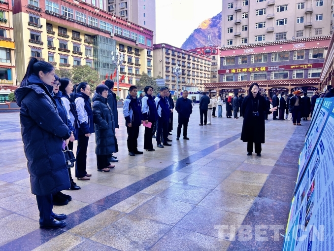 圖為援藏干部在雅江縣廣場(chǎng)上觀看展板 攝影:龍真多吉