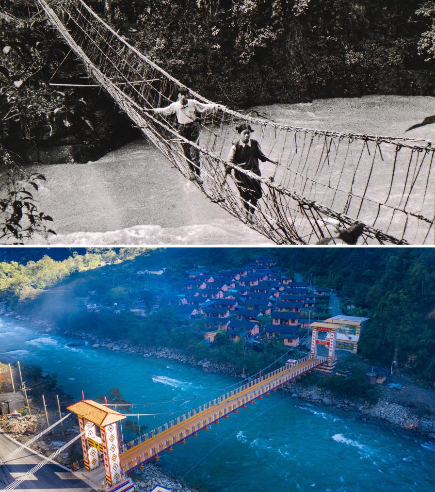 拼版照片:上圖為獨龍族群眾通過藤蔑橋(資料照片);下圖為獨龍江鄉(xiāng)白來感恩大橋(2020年10月29日攝,無人機照片,新華社記者胡超攝)。獨龍族是我國28個人口較少的民族之一,也是新中國成立初期從原始社會直接過渡到社會主義社會的少數民族,主要聚居在云南貢山獨龍族怒族自治縣獨龍江鄉(xiāng)。近年來,國家有關部門和云南省以整體推進的思路對獨龍江鄉(xiāng)進行集中幫扶,加速消除基礎設施、產業(yè)發(fā)展、人才素質等“瓶頸”問題,使當地經濟社會實現跨越式發(fā)展。2018年,獨龍族整族脫貧,實現“千年跨越”。