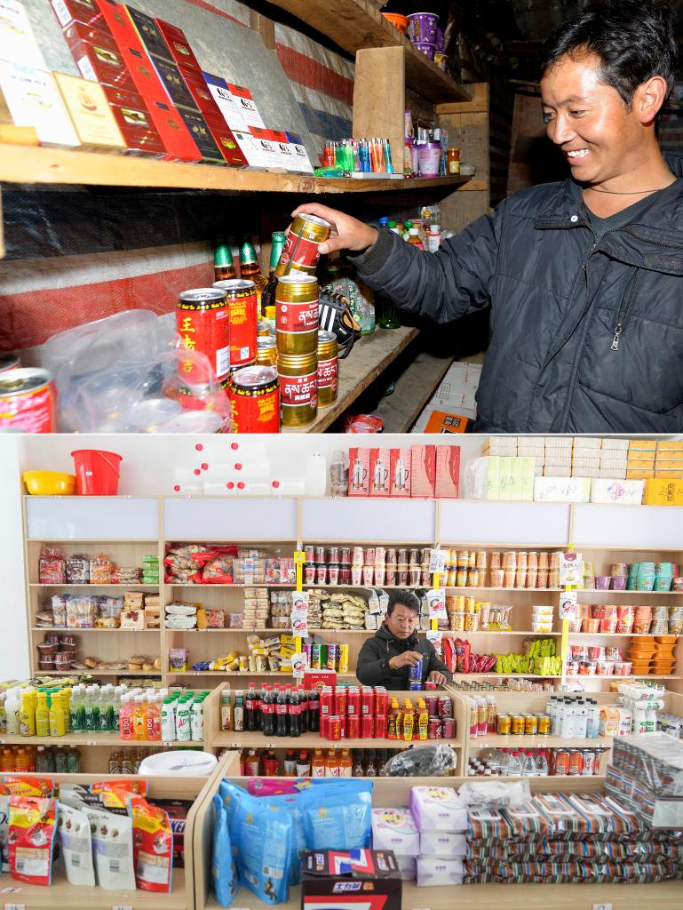 拼版照片:上圖為玉麥鄉(xiāng)一家商店的店主次旦扎西在擺放商品(新華社記者普布扎西攝,2009年9月9日攝);下圖為玉麥鄉(xiāng)一家超市的工作人員白瑪旺堆在店內整理商品(新華社記者丁汀攝,2024年10月15日攝)。西藏自治區(qū)山南市隆子縣玉麥鄉(xiāng)地處喜馬拉雅山脈南麓。受惡劣自然條件影響,這里一度只有桑杰曲巴和女兒卓嘎、央宗三人居住,牢牢守在祖國邊境線上,這里也曾被稱為“三人鄉(xiāng)”。如今,曾經的“三人鄉(xiāng)”已經發(fā)展到67戶200多人,變成下轄兩個行政村的“小康鄉(xiāng)”。學校、衛(wèi)生院、游客接待中心等建筑物在這里拔地而起,不少村民用自家房屋開起了家庭旅館、小賣部、快遞站等……2023年,玉麥全鄉(xiāng)人均年收入超4萬元,人均居住面積達40平方米。如今的玉麥,迎來了“蝶變”。