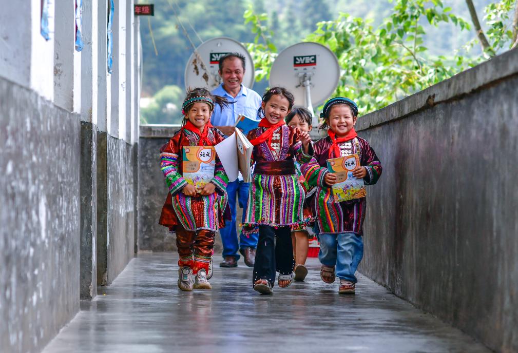 貴州省黔東南苗族侗族自治州從江縣西山鎮(zhèn)的中寨教學點,教師孟榮達(后)與學生們在下課后走出教室(2024年9月6日攝)。新華社記者 楊文斌 攝