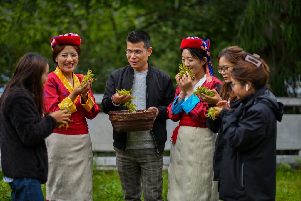 安徽省援藏干部王天柱(左三)為西藏錯那市的貢日門巴民族鄉(xiāng)斯木村干部群眾講解莓茶采摘技術要求(2023年7月28日攝)。新華社記者 姜帆 攝
