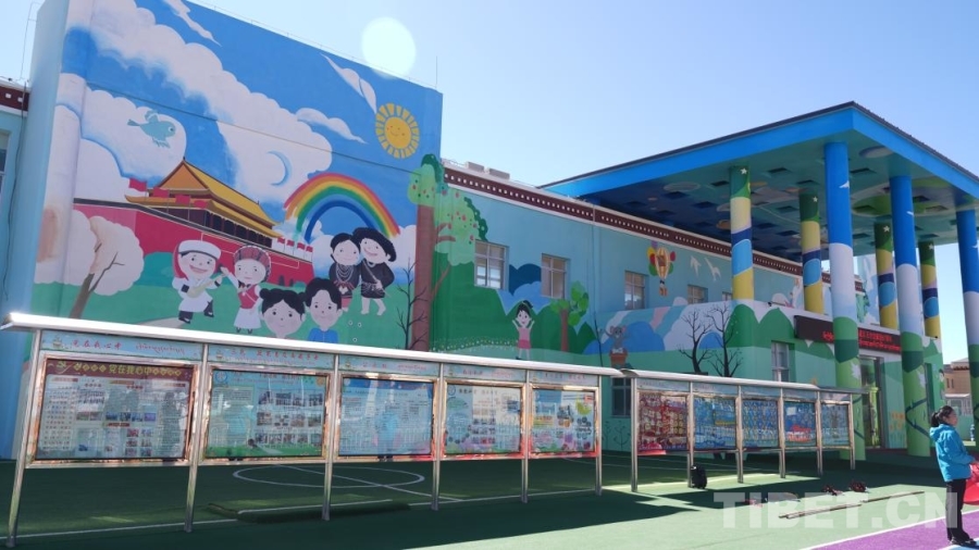 拉孜縣第二幼兒園主教學(xué)樓外墻上的多民族卡通形象