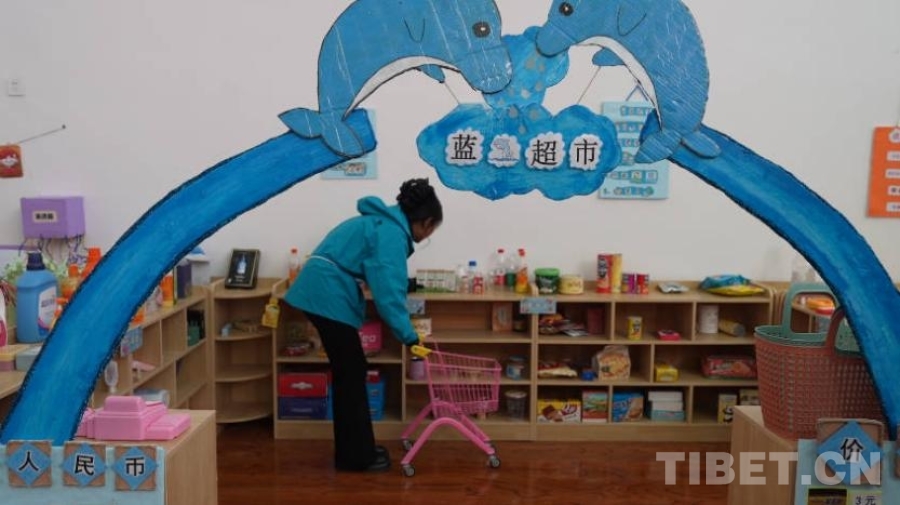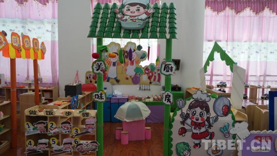 活動室內(nèi),分區(qū)域模擬了娃娃家、警察局、理發(fā)店、小廚房、超市、醫(yī)院等生活場景?!按蟛糠中∨笥堰€處于不識字的階段,所以我們盡量用圖片等形式幫助他們理解每個場景、每個步驟?!痹谶@個手工打造的小小“社區(qū)”里,孩子們通過角色扮演,模擬超市選購與結(jié)賬、醫(yī)院掛號就醫(yī)、照顧家庭成員、理發(fā)、烹飪等生活場景。如果發(fā)現(xiàn)其他小朋友的“不良”行為,甚至可以前去“警察局”按流程“報案”。不同于其他的商業(yè)化兒童場景模擬體驗區(qū)域,拉孜縣第二幼兒園活動室的道具大部分由教師們制作而成,手工打造的8個模擬場景盡顯用心和細(xì)致。