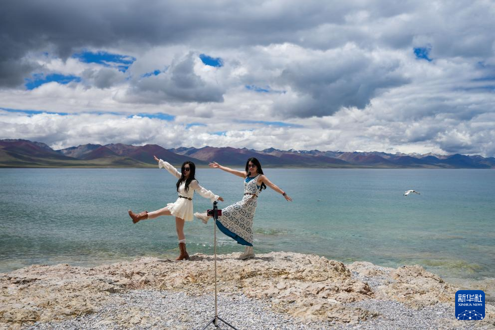 7月16日,兩名游客在納木錯湖邊自拍。新華社記者 晉美多吉 攝  ??