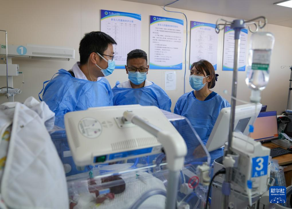 在那曲市人民醫(yī)院新生兒重癥監(jiān)護(hù)室,來(lái)自大連醫(yī)科大學(xué)附屬第一醫(yī)院的援藏醫(yī)生田聰亮(左)與吉美多布杰(中)、護(hù)士旦珍合作,為一名早產(chǎn)兒實(shí)施機(jī)械通氣治療(7月18日攝)。吉美多布杰2003年從四川大學(xué)華西醫(yī)學(xué)院畢業(yè)來(lái)到那曲市人民醫(yī)院工作,他先后和8批援藏專家合作、學(xué)習(xí)。新華社記者 晉美多吉 攝 ??