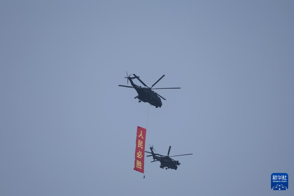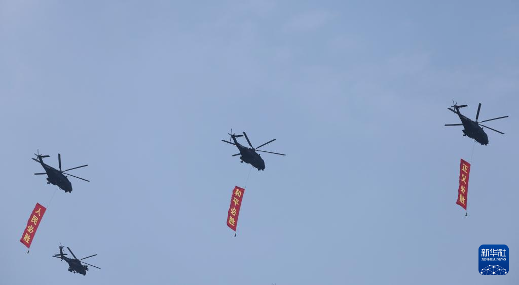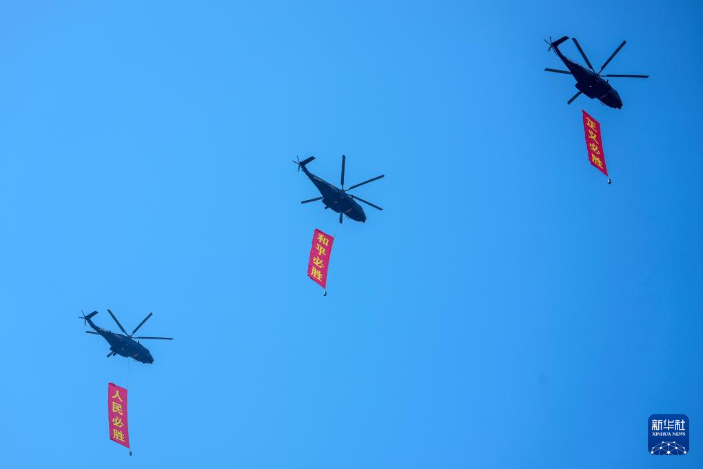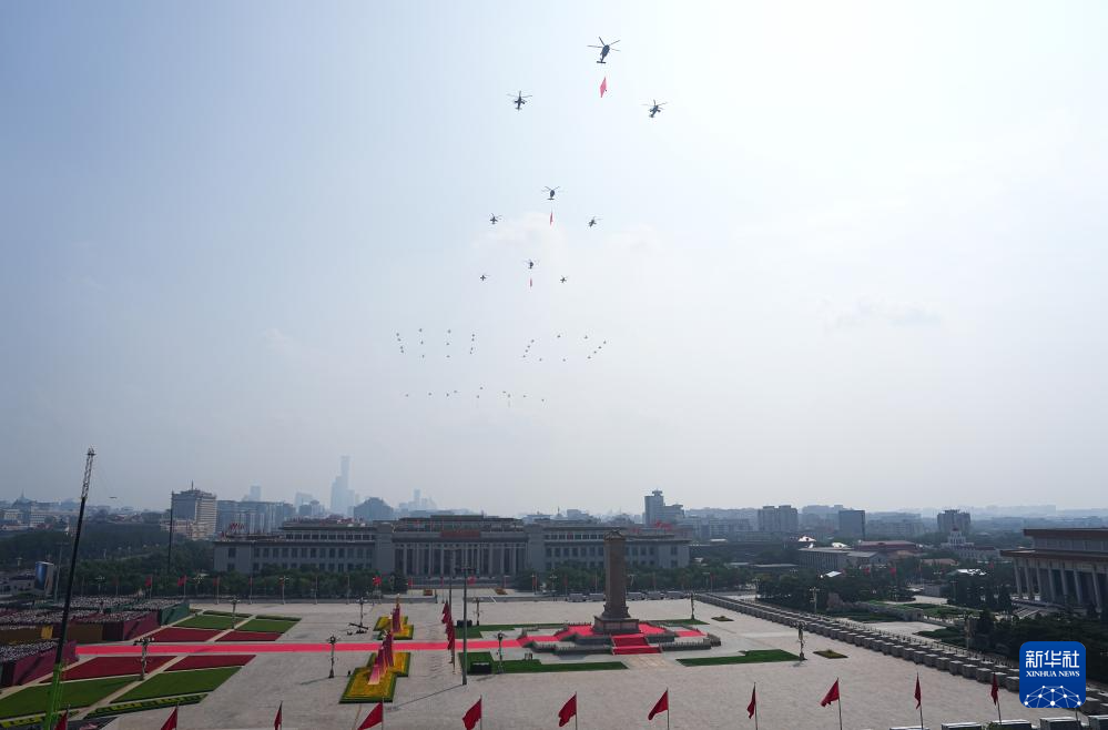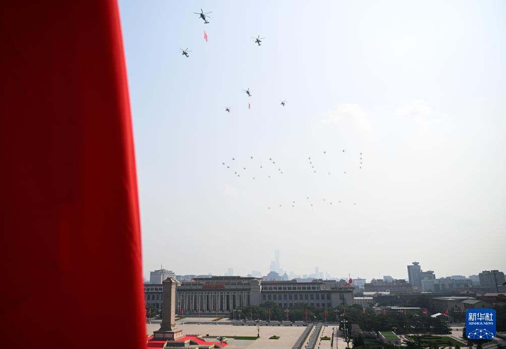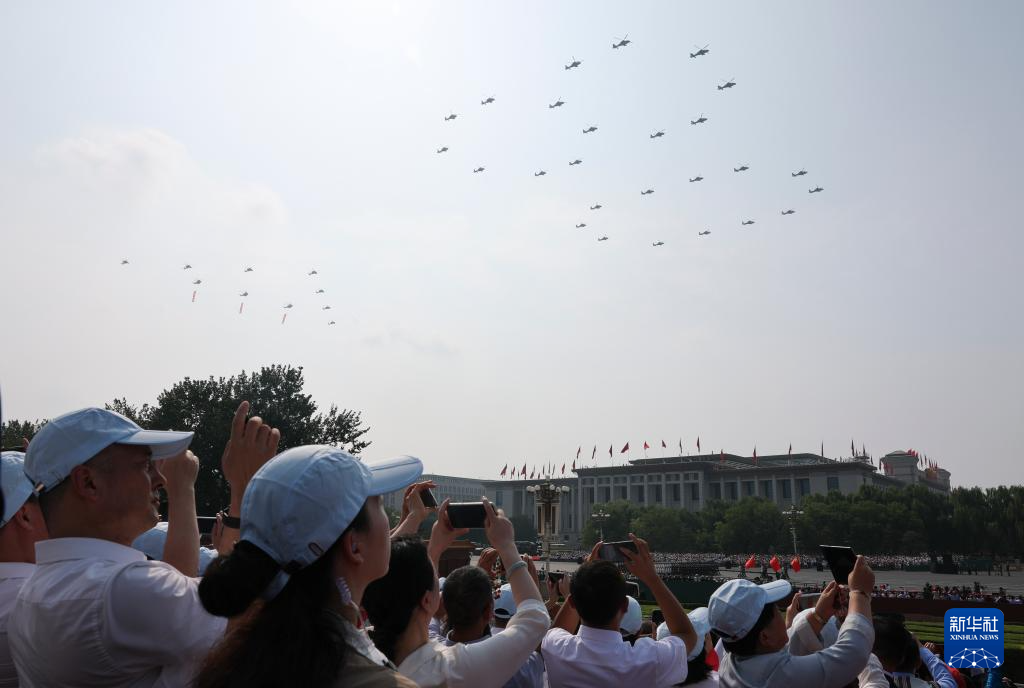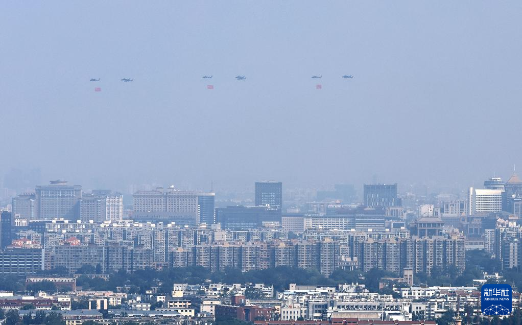 9月3日,紀念中國人民抗日戰(zhàn)爭暨世界反法西斯戰(zhàn)爭勝利80周年大會在北京隆重舉行。這是空中護旗梯隊飛過天安門廣場上空,26架直升機匯成巨大的“80”字樣。
