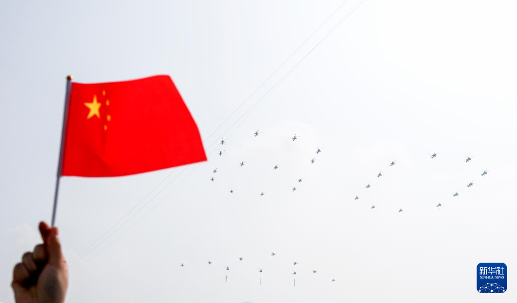9月3日,紀念中國人民抗日戰(zhàn)爭暨世界反法西斯戰(zhàn)爭勝利80周年大會在北京隆重舉行。這是空中護旗梯隊。