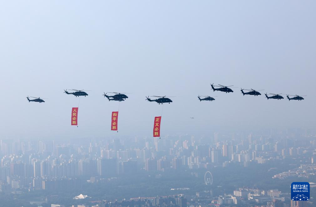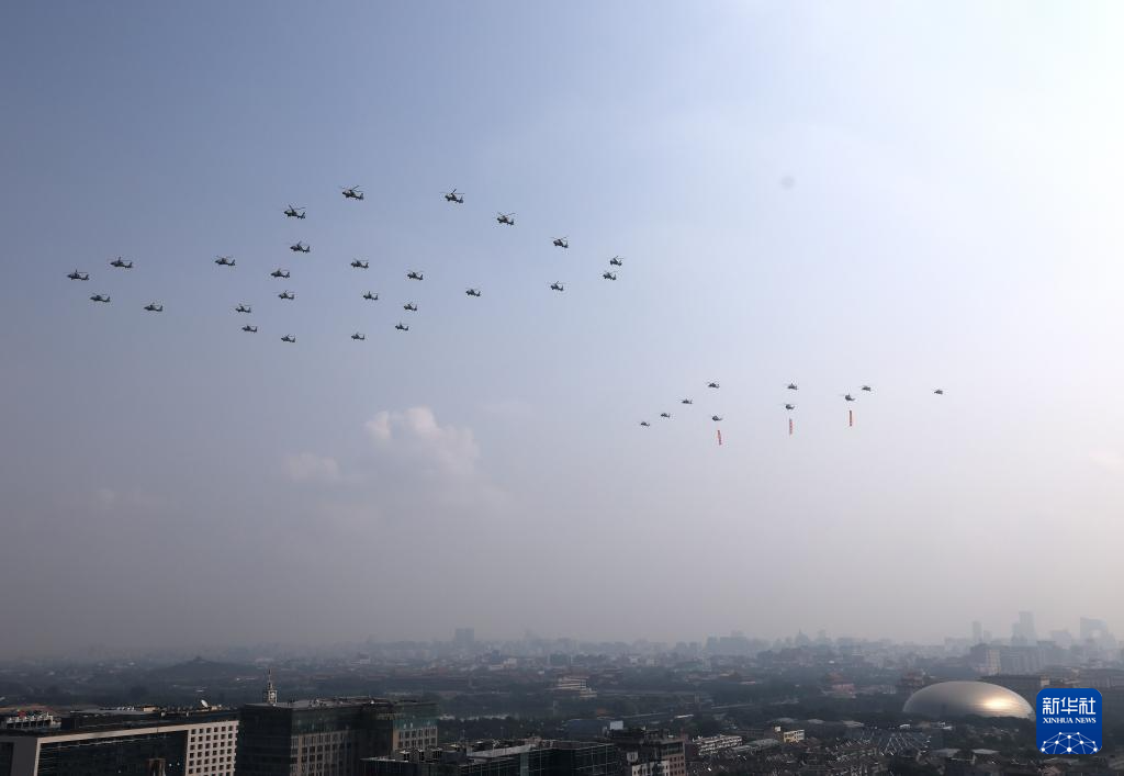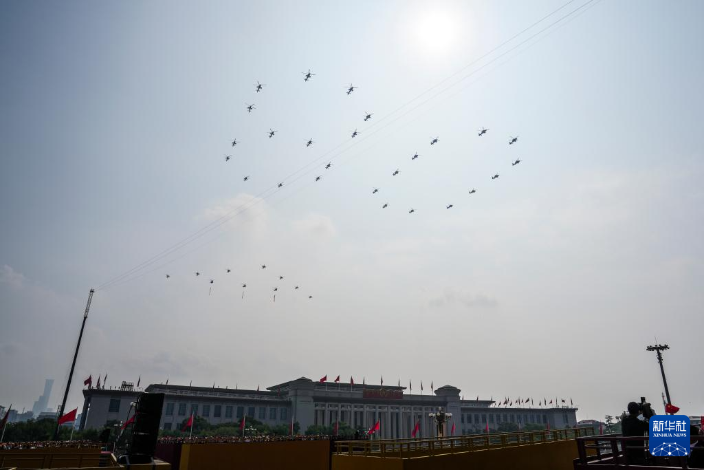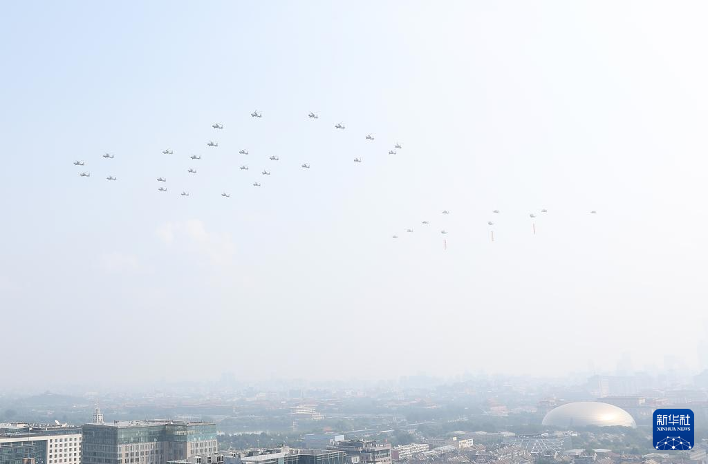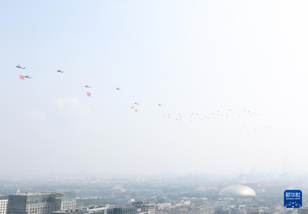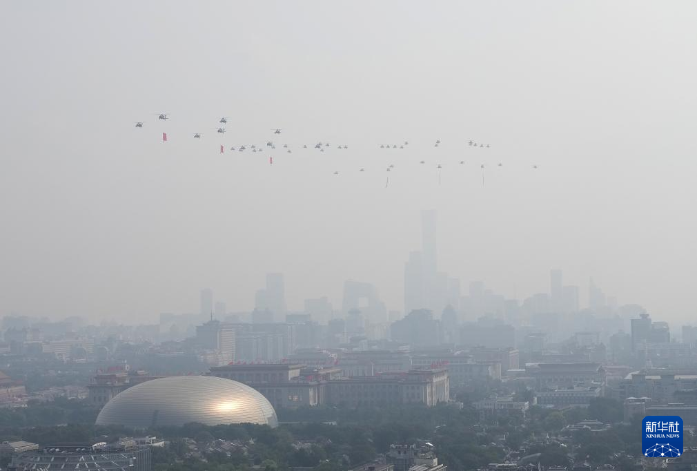 9月3日,紀念中國人民抗日戰(zhàn)爭暨世界反法西斯戰(zhàn)爭勝利80周年大會在北京隆重舉行。這是空中護旗梯隊通過天安門廣場。