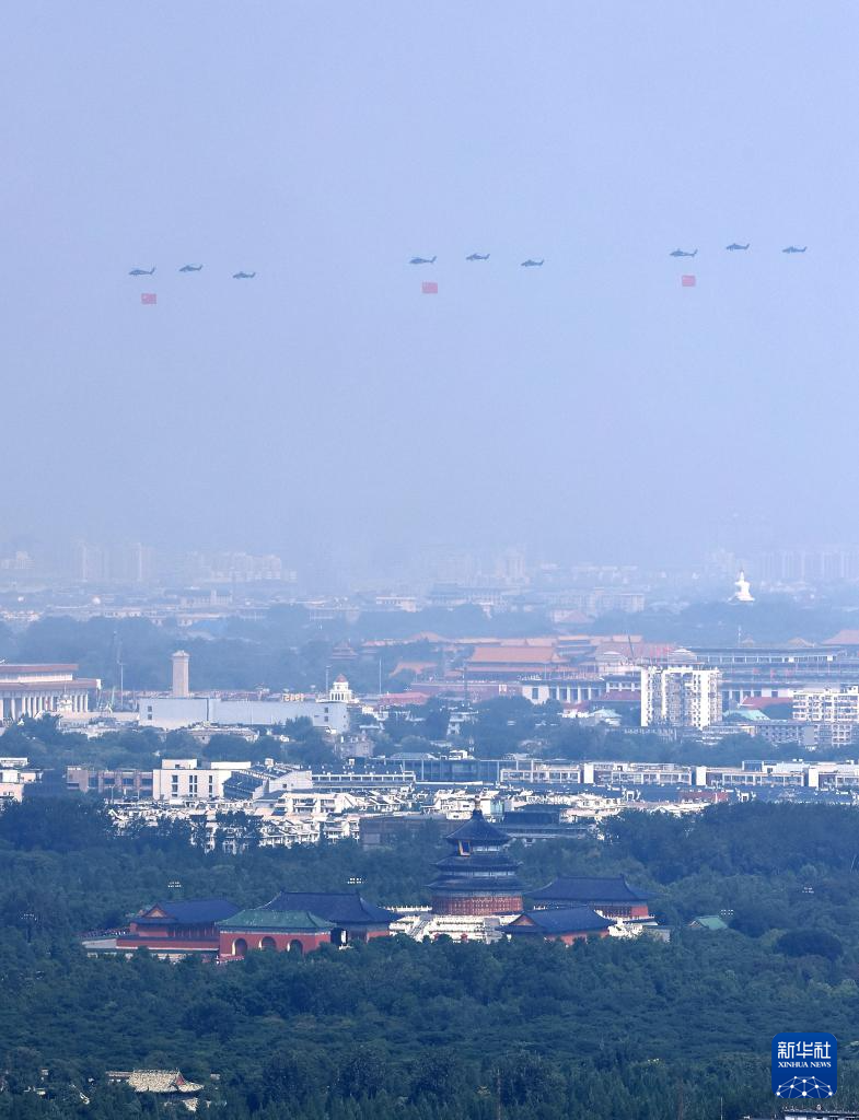 9月3日,紀念中國人民抗日戰(zhàn)爭暨世界反法西斯戰(zhàn)爭勝利80周年大會在北京隆重舉行。這是空中護旗梯隊飛過天安門廣場上空。