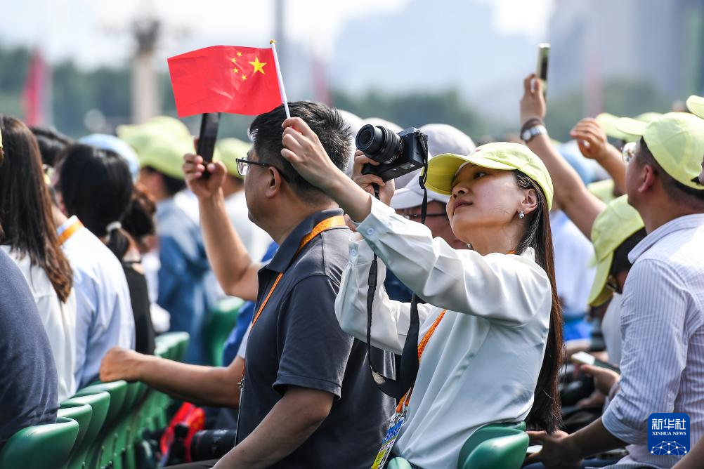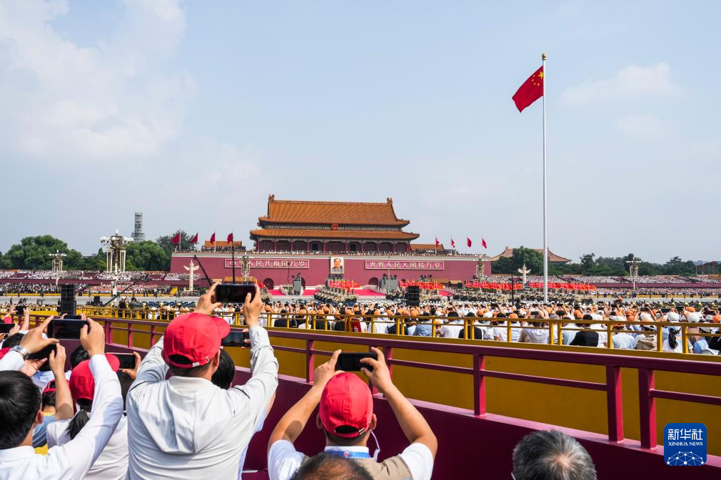 9月3日,紀念中國人民抗日戰(zhàn)爭暨世界反法西斯戰(zhàn)爭勝利80周年大會在北京隆重舉行。這是觀眾拍攝手中的國旗。