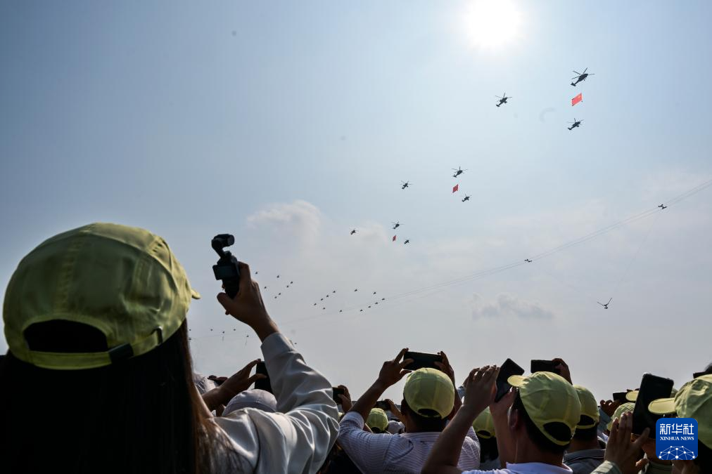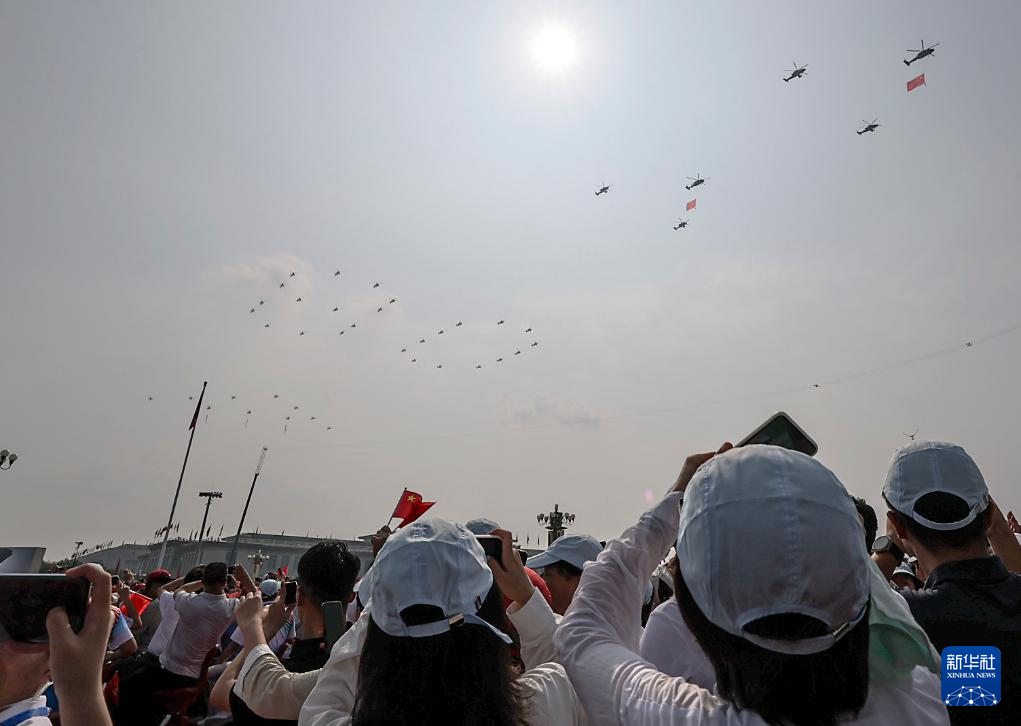 9月3日,紀念中國人民抗日戰(zhàn)爭暨世界反法西斯戰(zhàn)爭勝利80周年大會在北京隆重舉行。這是觀眾拍攝空中護旗梯隊通過天安門廣場。