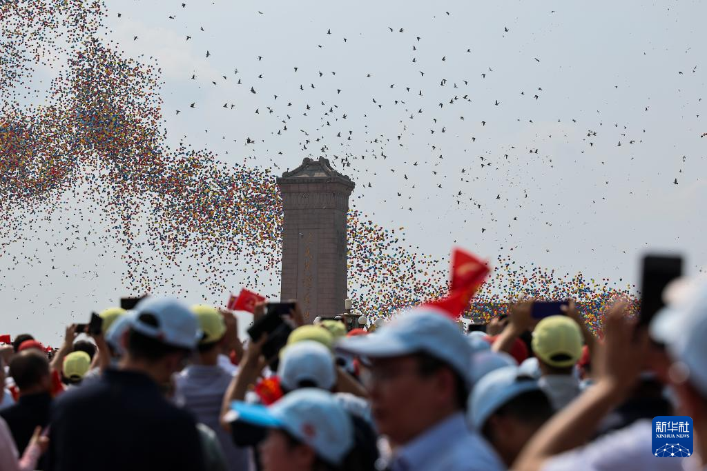 9月3日,紀(jì)念中國(guó)人民抗日戰(zhàn)爭(zhēng)暨世界反法西斯戰(zhàn)爭(zhēng)勝利80周年大會(huì)在北京隆重舉行。這是觀眾拍攝紀(jì)念大會(huì)現(xiàn)場(chǎng)放飛氣球和鴿子。