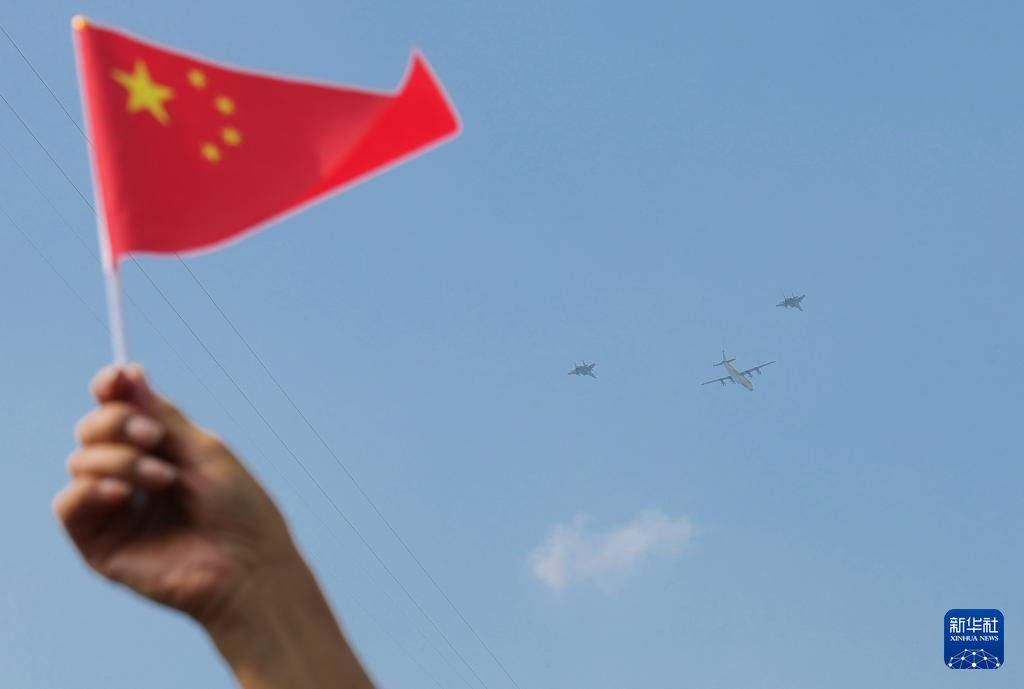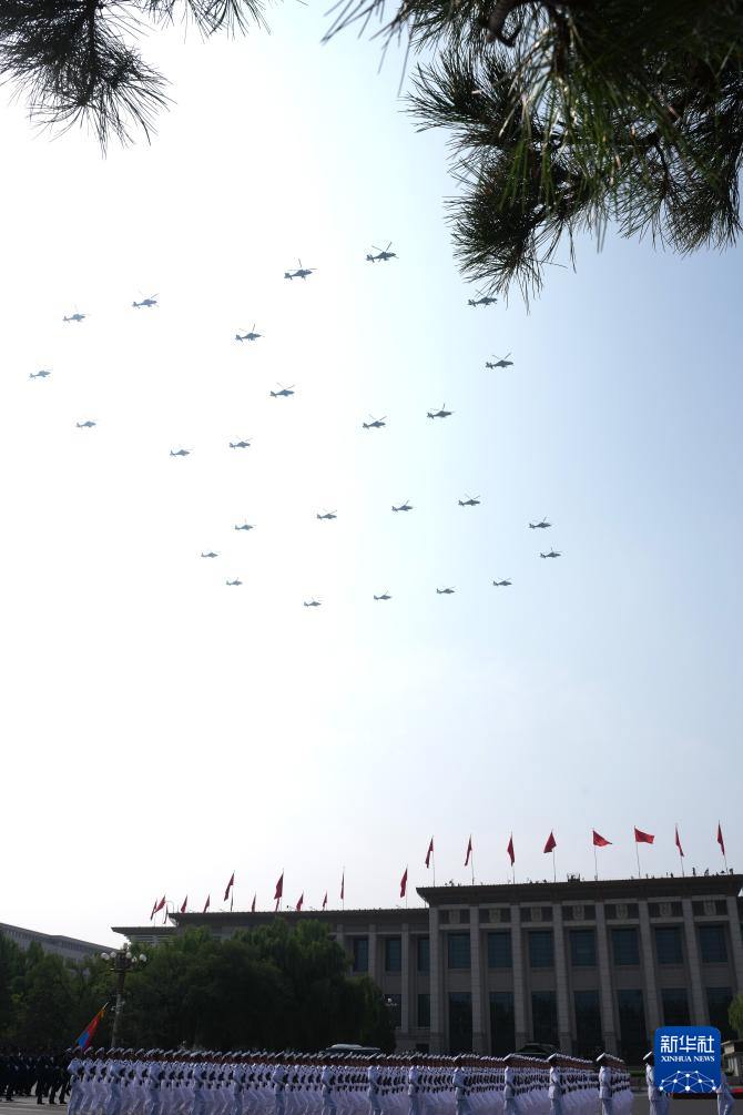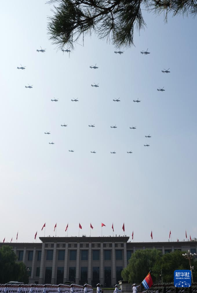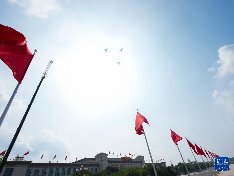 9月3日,紀念中國人民抗日戰(zhàn)爭暨世界反法西斯戰(zhàn)爭勝利80周年大會在北京隆重舉行。這是空中護旗梯隊。