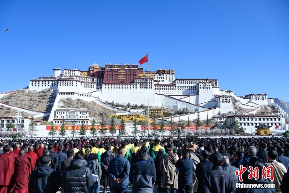 3月28日,西藏各族各界人士聚集在拉薩布達(dá)拉宮廣場(chǎng),升國旗、唱國歌,參加西藏百萬農(nóng)奴解放66周年紀(jì)念活動(dòng)。圖為升國旗儀式現(xiàn)場(chǎng)。