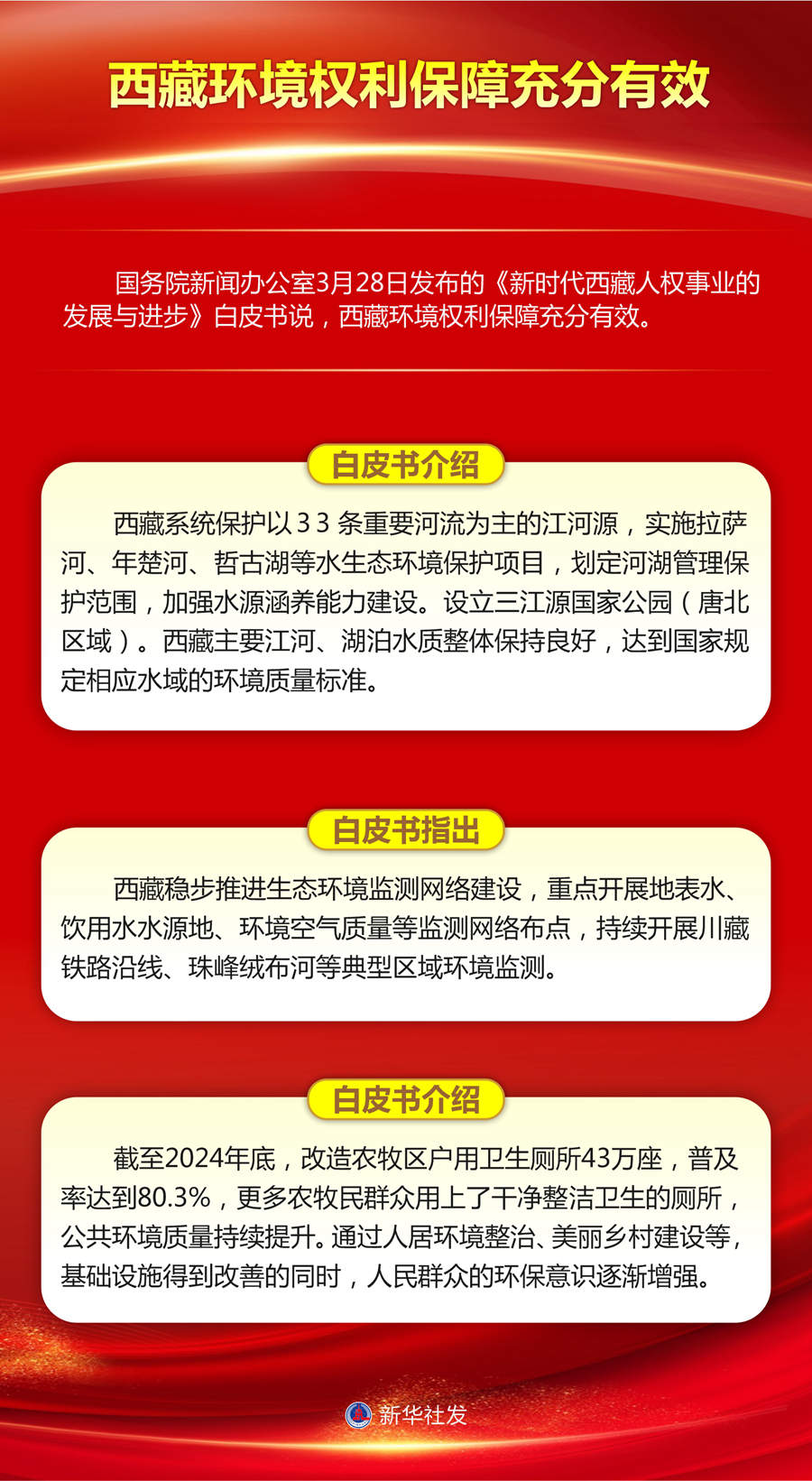 國務(wù)院新聞辦公室28日發(fā)布的《新時代西藏人權(quán)事業(yè)的發(fā)展與進(jìn)步》白皮書說,西藏環(huán)境權(quán)利保障充分有效。