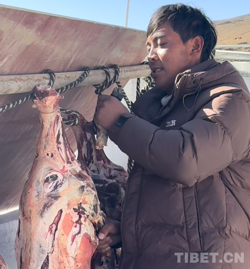 在定日縣長(zhǎng)所鄉(xiāng)古榮村,村民羅布正在新房前晾曬風(fēng)干羊肉?!斑@將是我們?cè)谛录疫^的第一個(gè)年,”他說,“希望一年比一年好?!憋L(fēng)干羊肉的香氣在冬日的空氣中飄散,炊煙從嶄新的屋頂升起,處處洋溢著即將到來的日喀則農(nóng)事新年的味道。