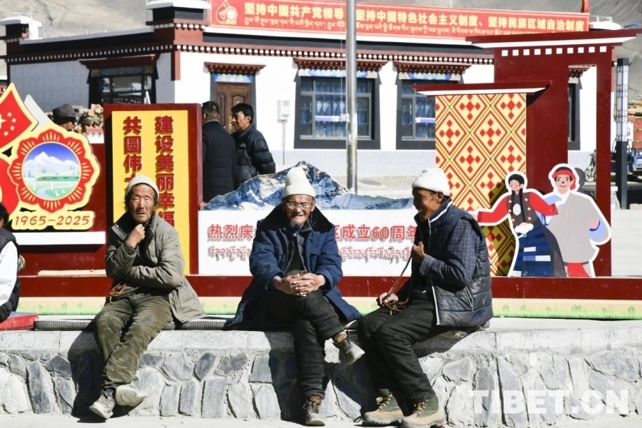 圖為定日縣長(zhǎng)所鄉(xiāng)森嘎村老人在村中廣場(chǎng)沐浴陽(yáng)光,快樂(lè)交談。攝影:趙振宇