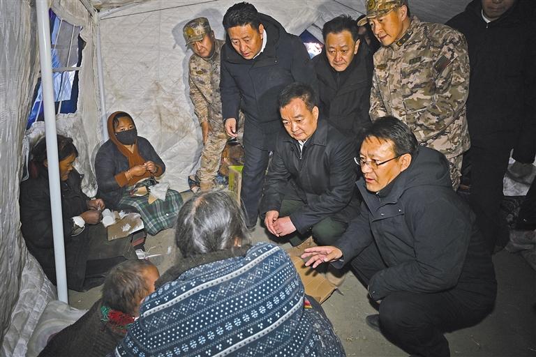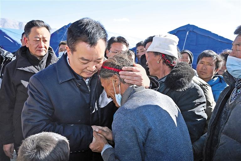 每到一處,王君正都向群眾轉(zhuǎn)達(dá)習(xí)近平總書記和黨中央、中央領(lǐng)導(dǎo)同志的關(guān)心關(guān)懷,告訴群眾相信有習(xí)近平總書記的關(guān)心關(guān)懷,我們就沒有克服不了的困難。當(dāng)受災(zāi)群眾聽到習(xí)近平總書記和中央領(lǐng)導(dǎo)同志的關(guān)心關(guān)懷,大家十分激動(dòng),許多群眾流下了感動(dòng)的淚水,對(duì)抗震救災(zāi)、重建家園燃起了信心。“我們就是擔(dān)心老人孩子晚上受凍感冒?!碑?dāng)聽到災(zāi)區(qū)群眾的擔(dān)心時(shí),王君正說:“你們的擔(dān)心正是我們的擔(dān)心。”天災(zāi)無情、人有情。在安置點(diǎn)上,王君正鼓勵(lì)受災(zāi)群眾堅(jiān)定信心,黨和政府一定會(huì)全力以赴開展抗震救災(zāi),大家要團(tuán)結(jié)一心、互幫互助,克服暫時(shí)的困難,加強(qiáng)統(tǒng)一規(guī)劃、重建新家園,齊心協(xié)力共建社會(huì)主義新農(nóng)村。晚上六點(diǎn)三十分許,海拔4400米的安置點(diǎn)上寒風(fēng)凜冽,看見已有帳篷陸陸續(xù)續(xù)搭建起來,王君正叮囑受災(zāi)群眾趕緊到帳篷里取暖,不要受涼受凍。他要求相關(guān)部門,要深刻認(rèn)識(shí)災(zāi)區(qū)地處高海拔區(qū)域的特殊情況,把受災(zāi)群眾御寒保暖工作擺在更加突出位置,加緊調(diào)集棉帳篷、棉衣、棉被、烤火爐等物資,加快帳篷安裝進(jìn)度,確保受災(zāi)群眾吃上熱飯、喝上熱水、住上帳篷、溫暖過夜、感受親情。要嚴(yán)防發(fā)生次生災(zāi)害,全面排查房屋受損情況,對(duì)嚴(yán)重受損的建筑嚴(yán)格管控,強(qiáng)化巡查值守,做好安全防范工作,嚴(yán)防火災(zāi),抓好衛(wèi)生防疫,配備預(yù)防流感等藥物,加強(qiáng)食品和飲用水衛(wèi)生監(jiān)管,堅(jiān)決維護(hù)災(zāi)區(qū)社會(huì)穩(wěn)定。要充分發(fā)揮基層黨組織戰(zhàn)斗堡壘作用和黨員先鋒模范作用,落實(shí)落細(xì)黨中央和自治區(qū)抗震救災(zāi)各項(xiàng)安排部署,主動(dòng)同受災(zāi)群眾吃住在一起,用心用情解決困難,引導(dǎo)受災(zāi)群眾開展自救、互幫互助,讓黨旗在抗震救災(zāi)一線高高飄揚(yáng)。黨政軍警民要協(xié)調(diào)聯(lián)動(dòng),解放軍、武警、消防、邊檢和地方各救援力量要統(tǒng)一指揮、統(tǒng)一調(diào)度、加強(qiáng)協(xié)同、密切合作,齊心協(xié)力抓好抗震救災(zāi)工作。