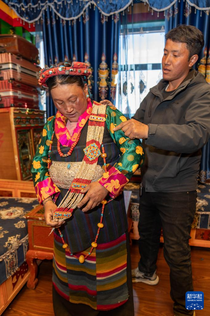2月16日,長所鄉(xiāng)古榮村村民桑杰(右)給愛人卓瑪次仁佩戴首飾。新華社記者 旦增尼瑪曲珠 攝