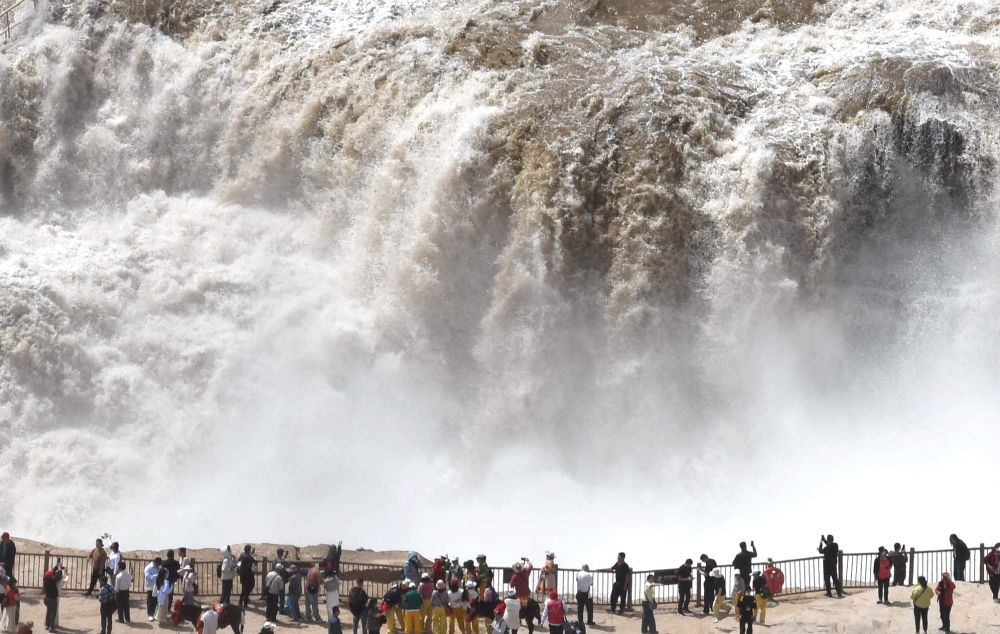 2025年4月9日,游客在山西吉縣黃河壺口瀑布景區(qū)欣賞壯美的“桃花汛”。