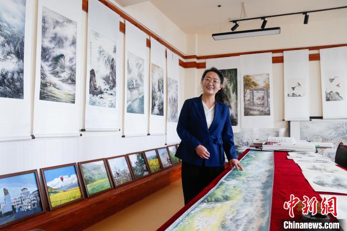 這幅彩墨山水圖出自全國(guó)人大代表、青海省海北藏族自治州門源回族自治縣第二寄宿制初級(jí)中學(xué)的美術(shù)老師郭金萍之手。