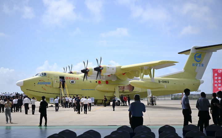 2025年6月11日在珠海中航通飛華南飛機工業(yè)有限公司拍攝的批量生產(chǎn)的首架AG600飛機。當(dāng)日,大型水陸兩棲飛機AG600“鯤龍”獲頒中國民航局生產(chǎn)許可證,標(biāo)志著AG600飛機正式邁入批量生產(chǎn)階段。新華社記者 鄧華 攝