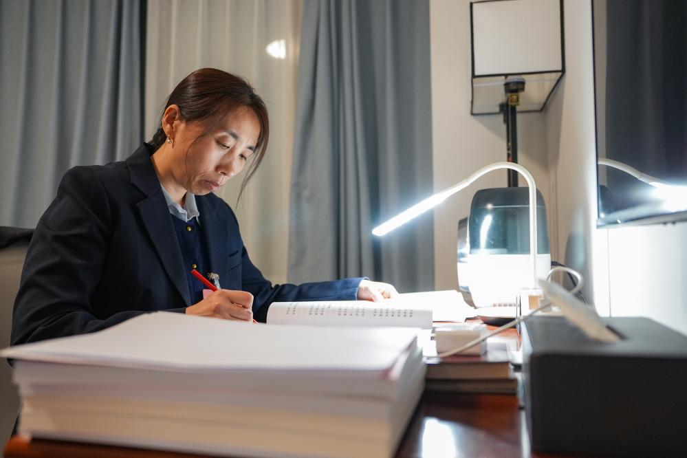 3月6日,郭紅靜代表在天津代表團(tuán)駐地閱讀政府工作報告。新華社記者 王曦 攝