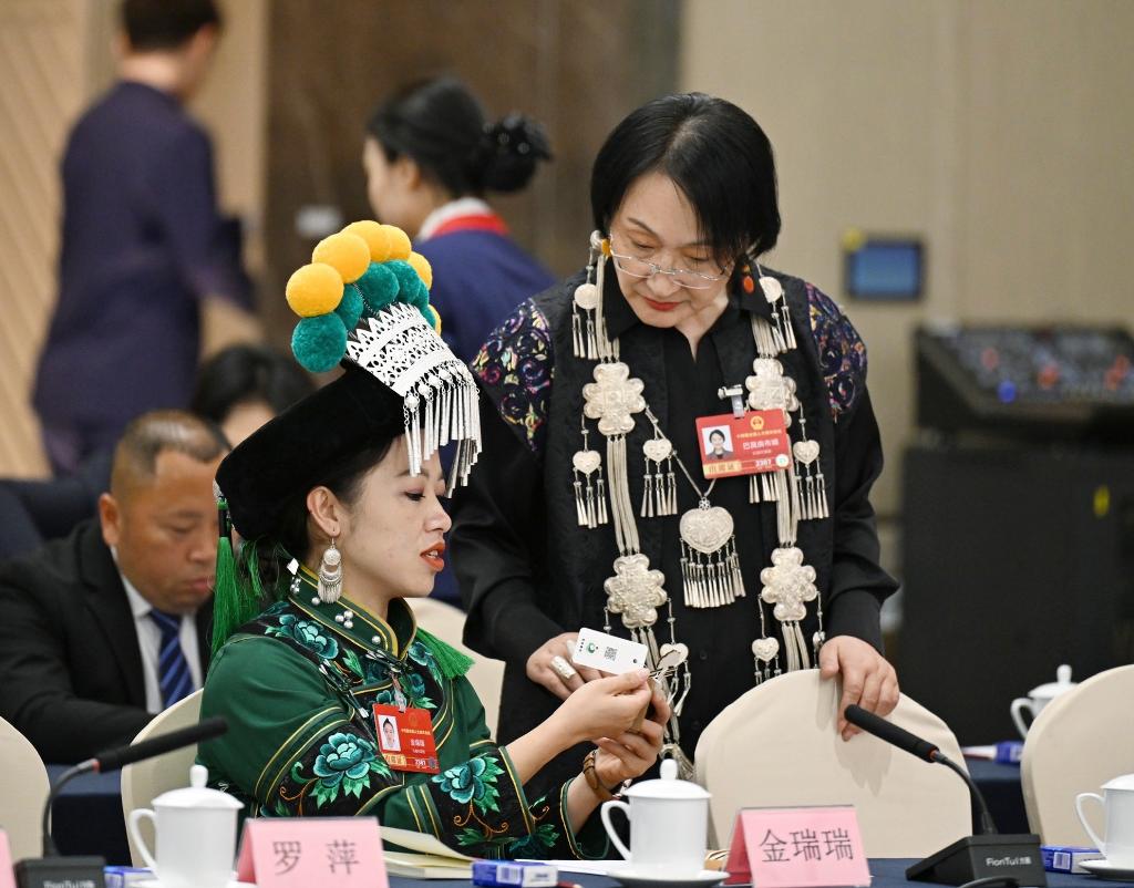 3月7日,金瑞瑞代表(前左)在十四屆全國人大四次會議云南代表團(tuán)開放團(tuán)組會議前與另一位代表交流。新華社記者 程婷婷 攝