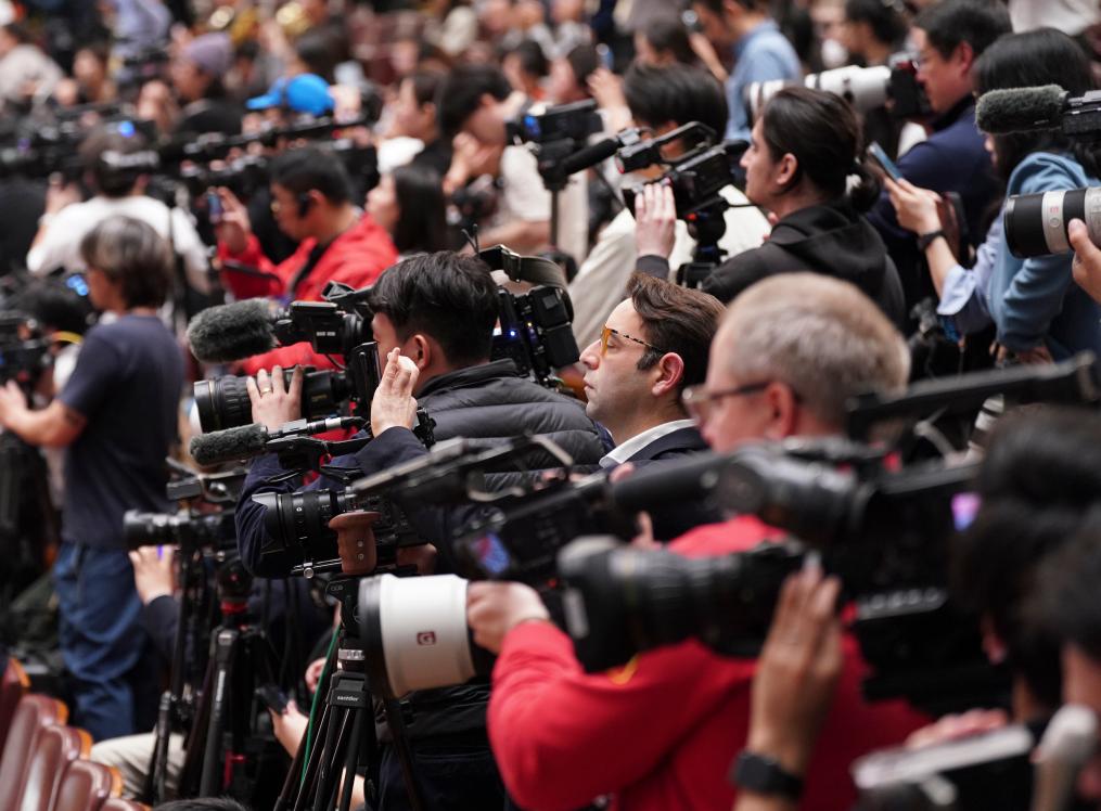 3月12日,十四屆全國(guó)人大四次會(huì)議在北京人民大會(huì)堂舉行閉幕會(huì)。這是記者在閉幕會(huì)上采訪。新華社記者 傅天 攝