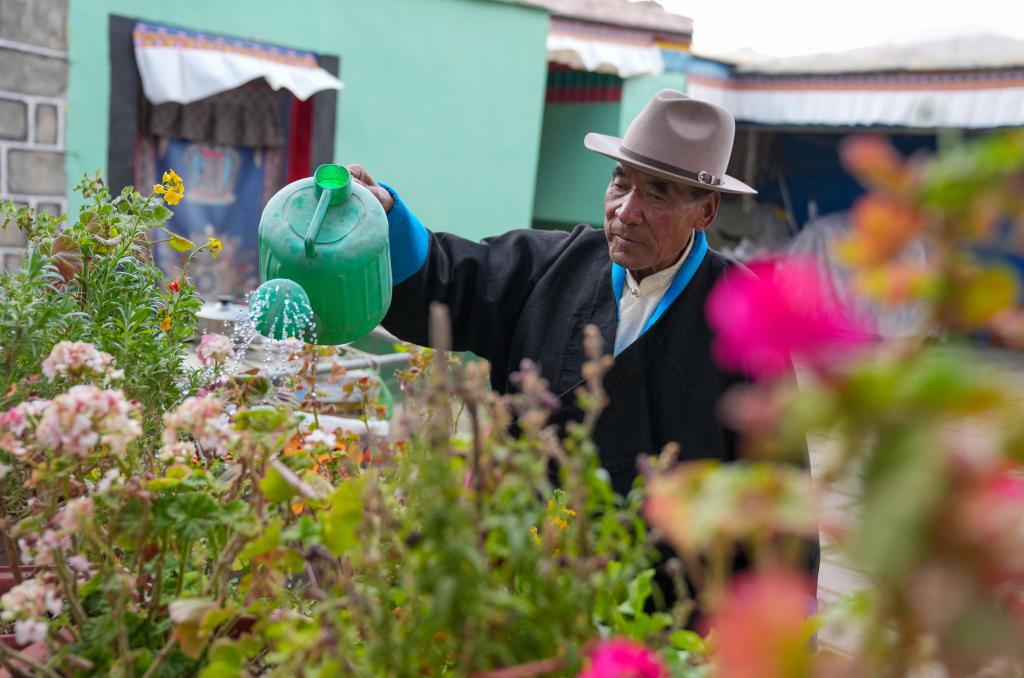 達(dá)瓦片多在院子里給花澆水(3月12日攝)。