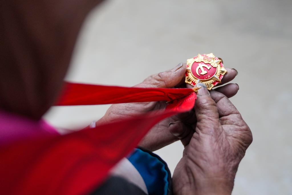 普珍佩戴上“光榮在黨50年”紀念章(3月12日攝)。
